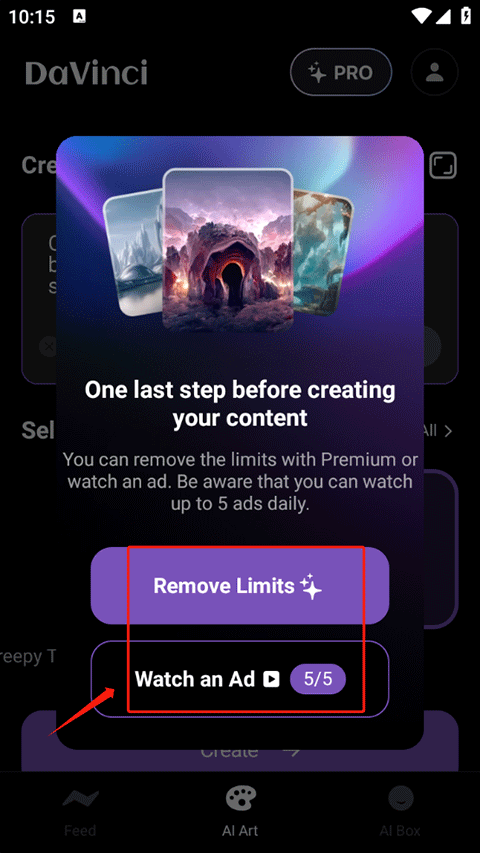 4、如果你充值了会员的话就点击Remove Limits生成,若没有则点击下面的观看广告来获取