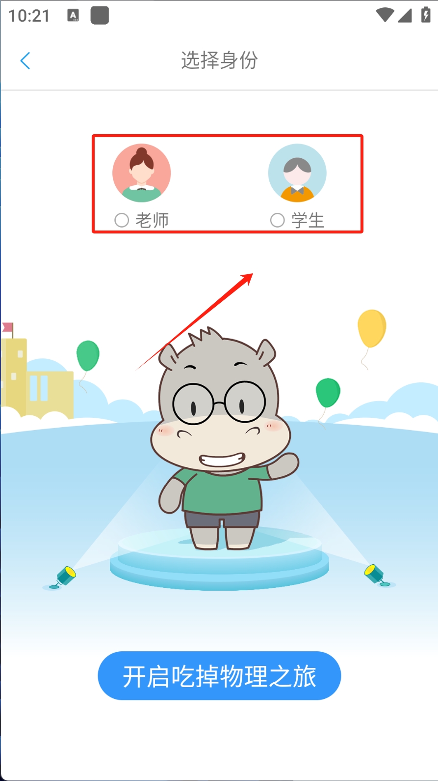 1、选择身份,点击“老师”或“学生”进行选择。