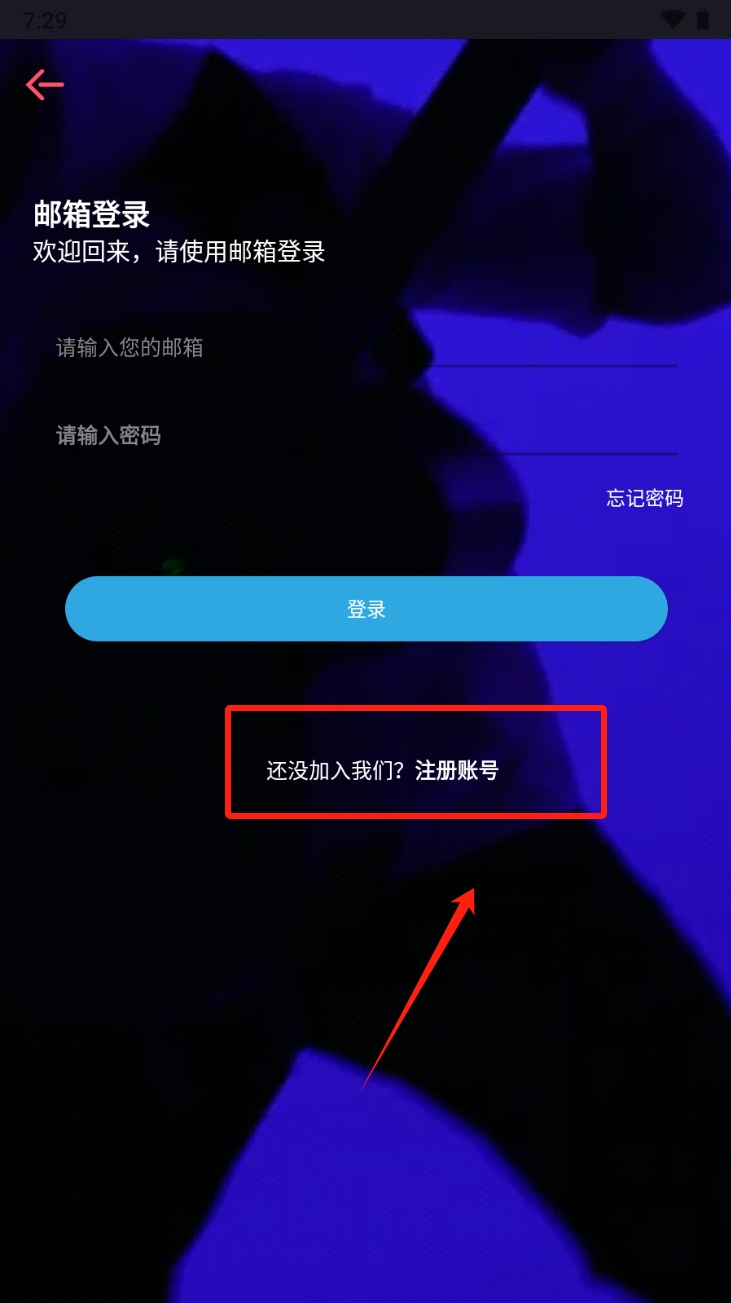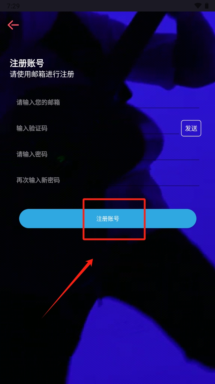 3、注册新账号:点击“注册账号”按钮,输入邮箱、验证码、密码并完成注册。