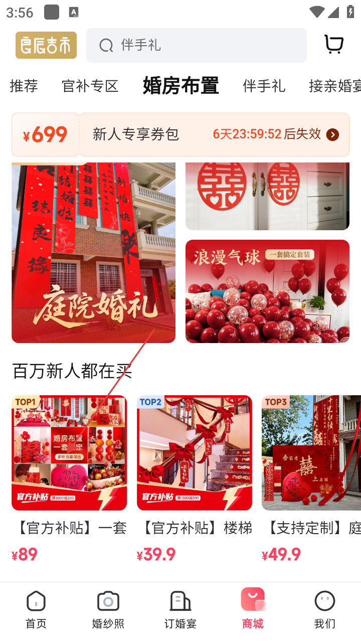 3、在商品展示界面,点击【官方补贴】-【一套搞定婚房布置】商品,进入该商品详情页面。