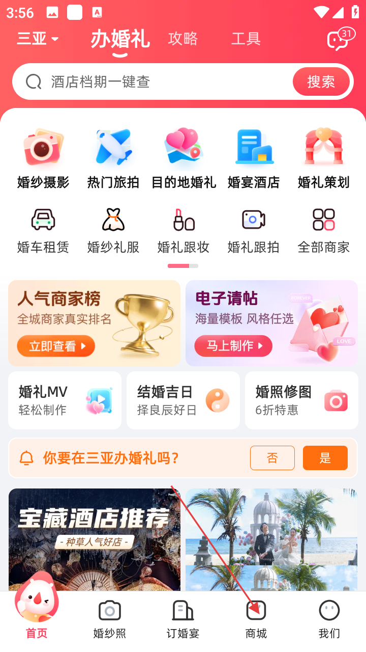 1、在婚礼纪首页,点击底部【商城】选项,进入商城页面,可选购各类婚礼用品。