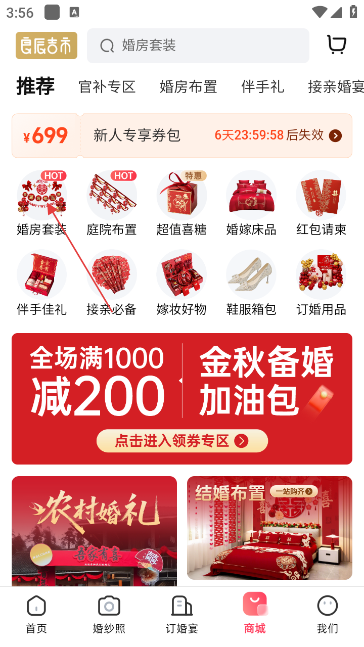 2、进入商城页面后,点击【婚房套装】选项,进入婚房套装相关商品展示界面,挑选心仪套装。
