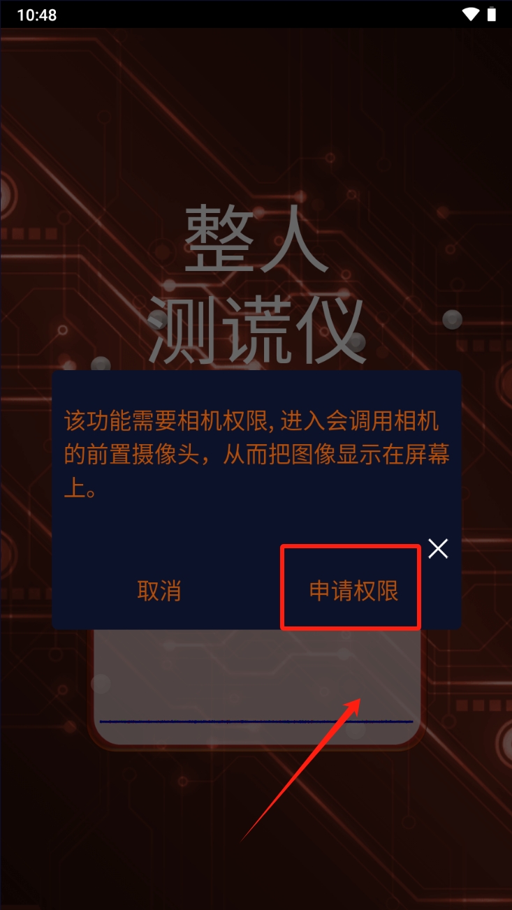 2、在权限申请提示中点击“申请权限”按钮,允许应用使用相机。