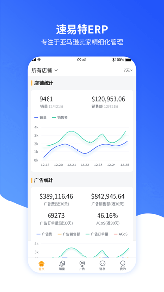 速易特ERP作为一款面向亚马逊卖家的一站式专业管理系统,能实现运营、客服、仓库、财务等电商公司各环节的一体化管理。这里介绍的是速易特ERP的移动端,它具备销量统计、广告管理以及单据审批等功能,助力运营人员精准洞察关键数据,实时掌握运营管理的每一个环节,进而提升运营效率。