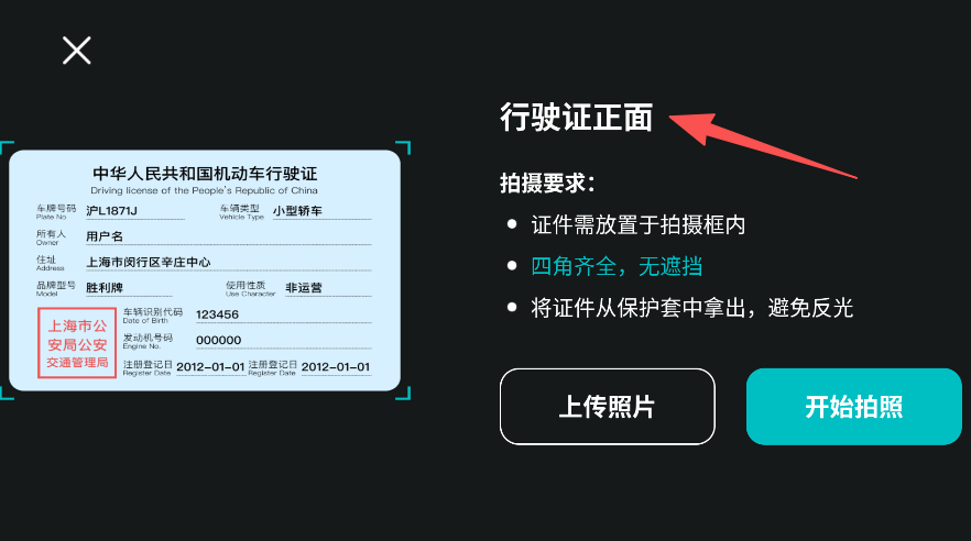 2、拍摄指引清晰,驾驶证、行驶证拍摄要求详细,用户拍摄证件更规范,信息识别更高效。
