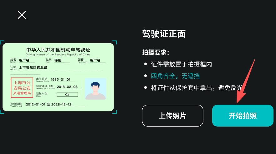 2、拍摄驾驶证,按要求放置证件,开始拍照或上传照片。
