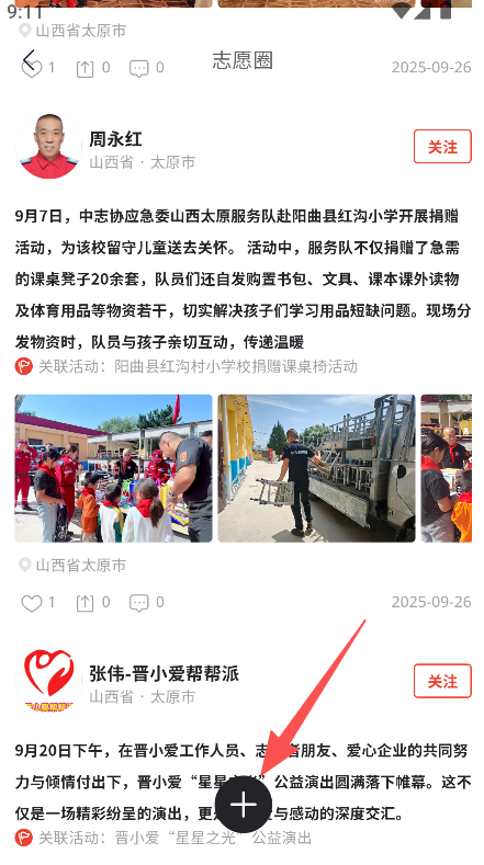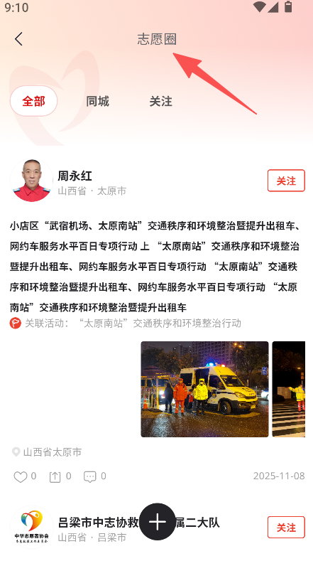 2、板块分层清晰,志愿圈(全部、同城、关注)与发布功能环节明确,适配不同公益场景,提升公益参与效率。