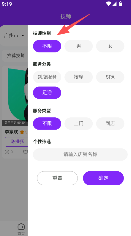 1、进入技师板块,筛选技师性别、服务分类。