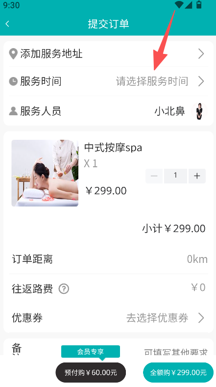 3、添加服务地址、选择服务时间,提交订单。