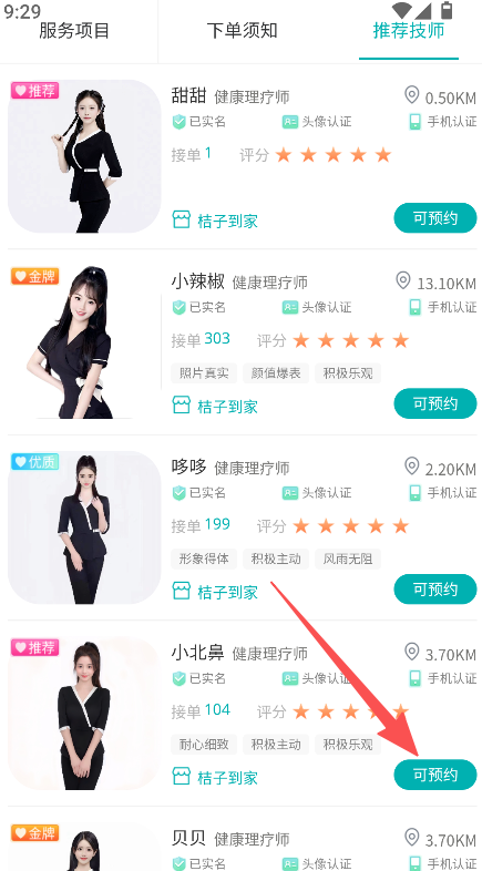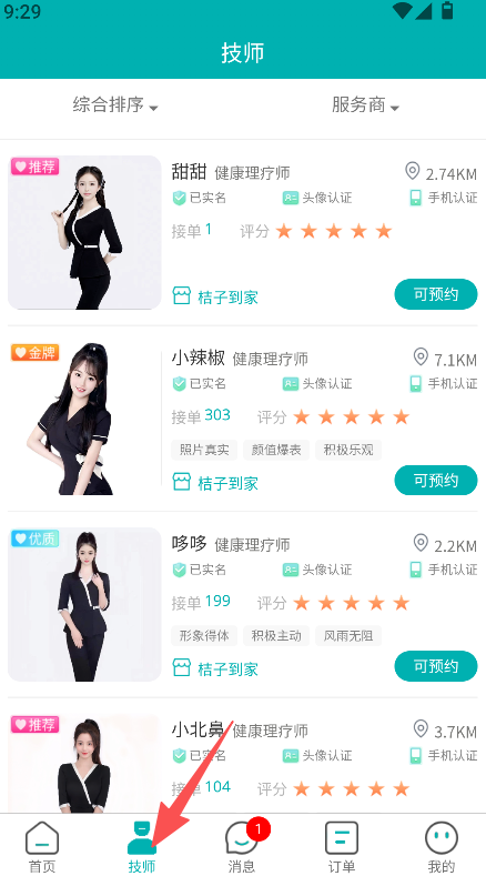 1. 点开技师板块,挑选能够预约的技师。