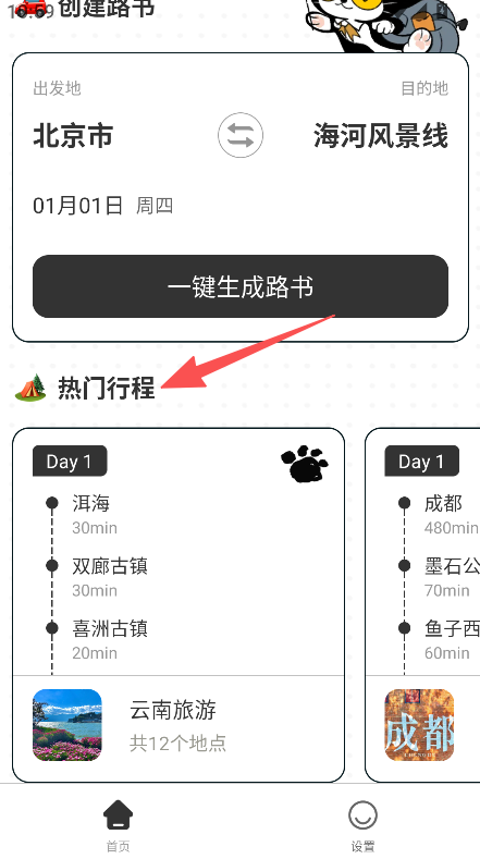 1. 可挑选热门行程,也能自行创建路书,设定出发地与目的地,从而生成自驾行程。