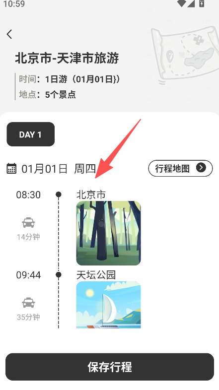 2、查看行程详情,了解各景点时间安排与路线。