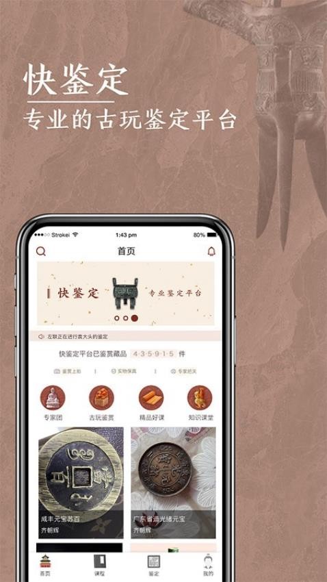 快鉴定,是专门为古文玩爱好者精心打造的古文玩鉴定服务平台。平台上有众多古文玩专家坐镇。借助这个平台,你能轻松完成古文玩鉴定。只需直接拍摄古文玩的各类照片,发布到平台,就能寻求专家鉴定。专家会依据你所拍摄的照片,给出详细讲解,让你知晓古文玩的真伪。 不仅如此,快鉴定还提供丰富的古文玩大师课程内容。今后,你可通过平台学习,在学习过程中,积累更多古文玩鉴定经验,掌握更多鉴定技巧,这将为你日后的古文玩鉴定给予十分良好的指导。有需要的用户,赶快行动起来吧!快鉴定绝对能满足广大古文玩爱好者的需求!