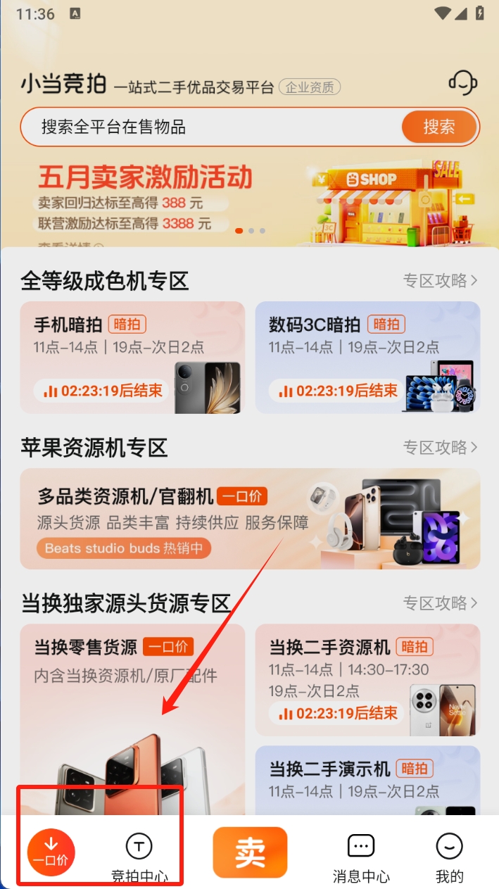 1、在小当竞拍首页,点击“一口价”按钮,进入一口价商品页面,浏览并选择商品。