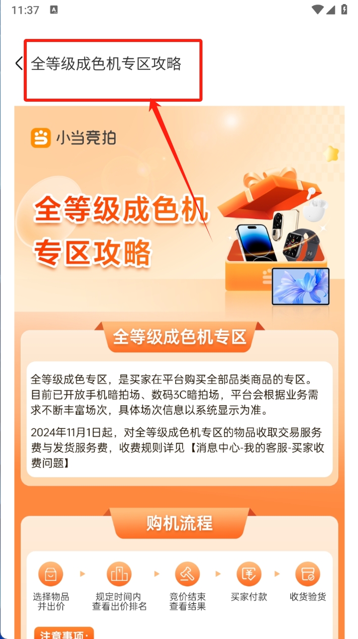 2、点击“全等级成色机专区”进入专区攻略页面,查看专区介绍和购买流程。