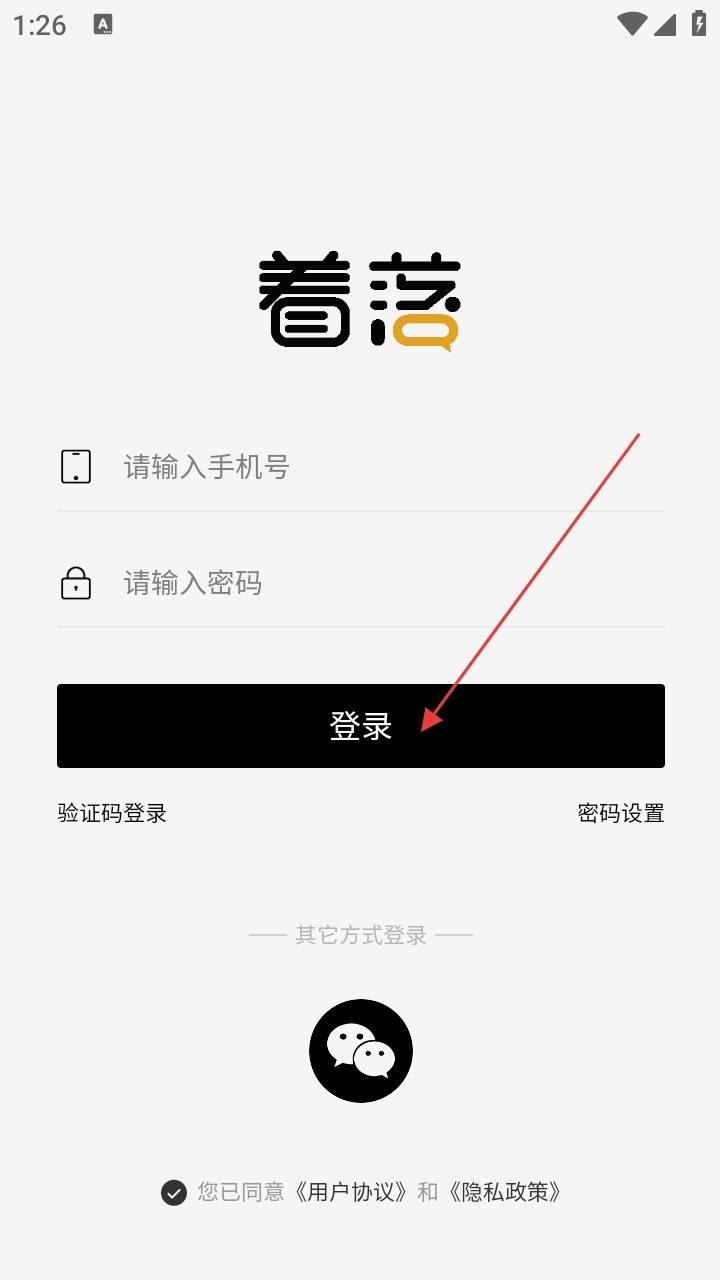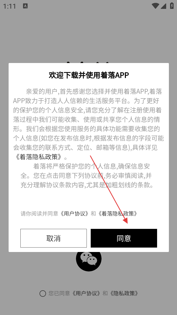 1、首次使用,在【用户协议和隐私】弹窗点【同意】,进入登录页。