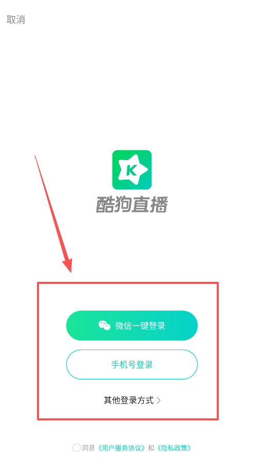 1、首先打开酷狗直播软件,在登录页面可以选择微信一键登录或者手机号登录,记得勾选同意用户服务协议和隐私政策。