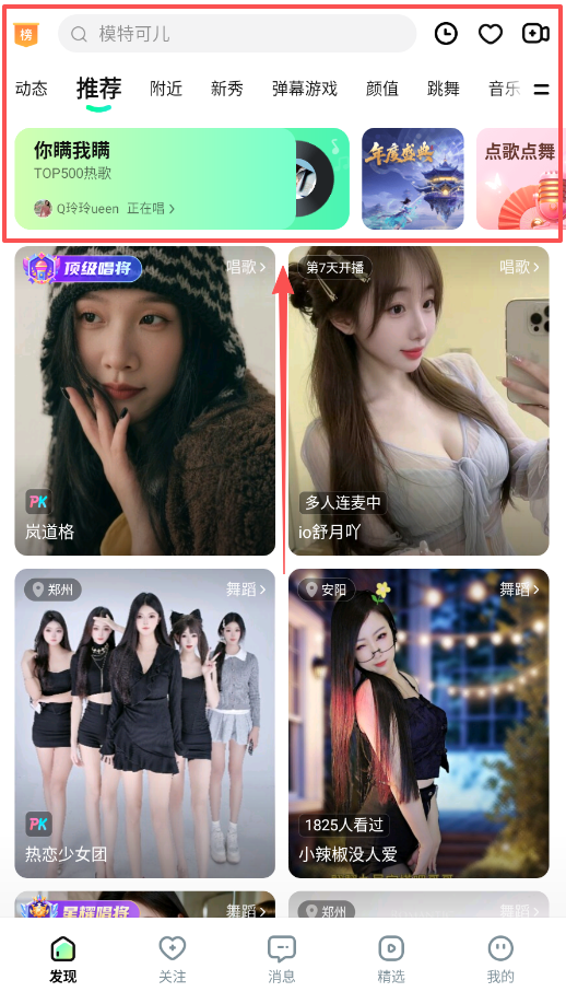 2、进入主界面后,在推荐榜这里可以看到各种类型的直播,比如弹幕游戏、颜值、跳舞和音乐等,你可以上下滑动浏览。