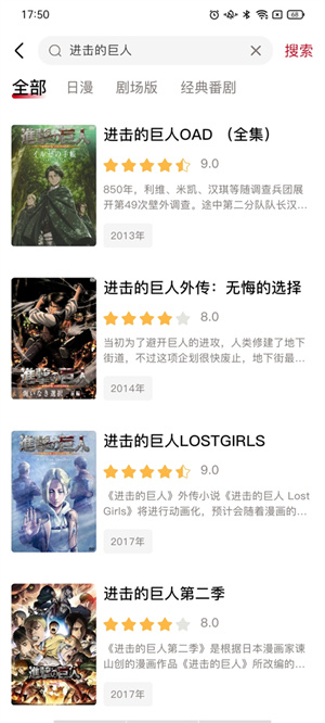 2、点击搜索栏我们可以直接搜索相应的动漫,如进击的巨人;