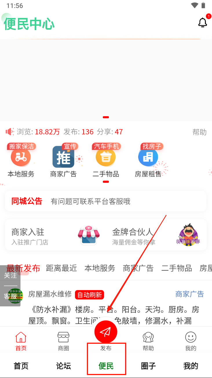 3、点击“便民”进入便民中心,选择服务类别查看或发布信息。