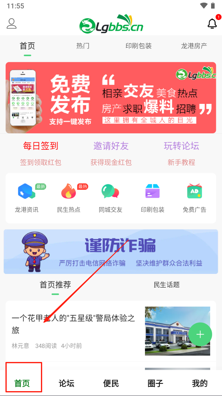 1、点击“首页”查看推荐内容和每日签到领取红包。