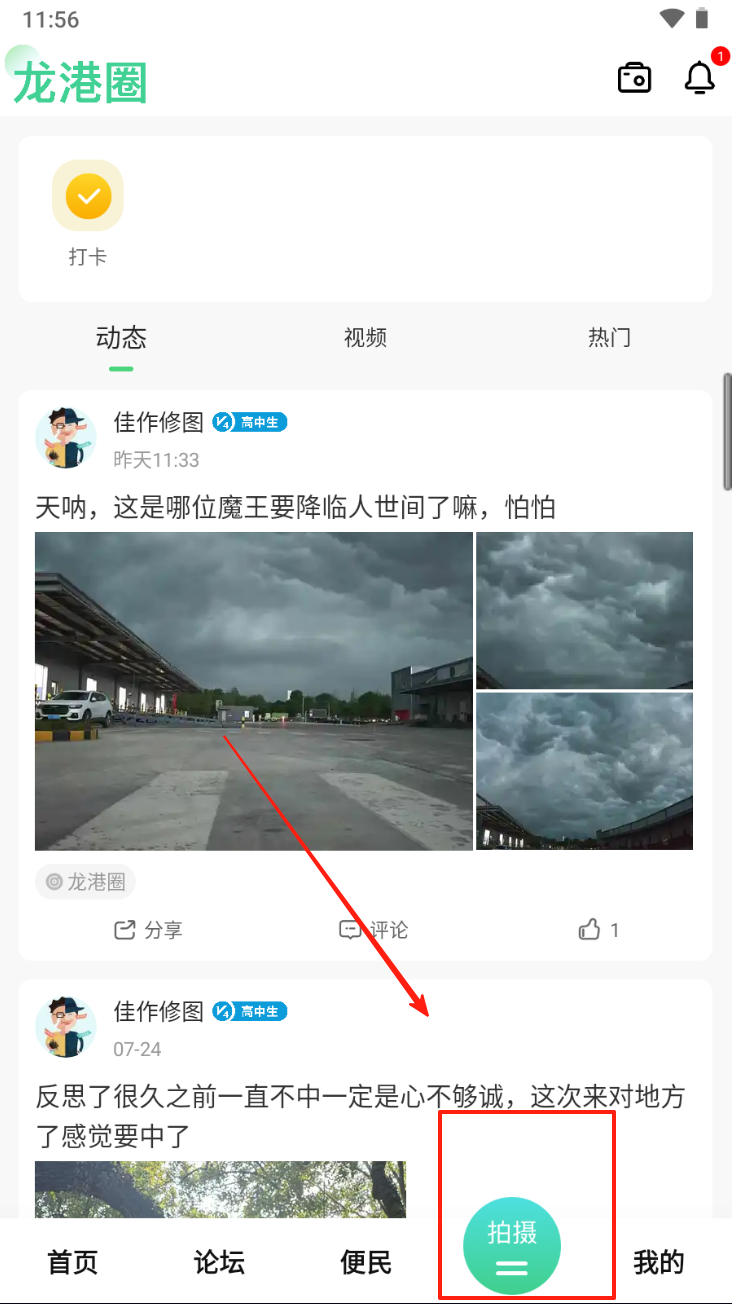 4、点击“圈子”进入龙港圈,查看动态或拍摄照片分享生活。