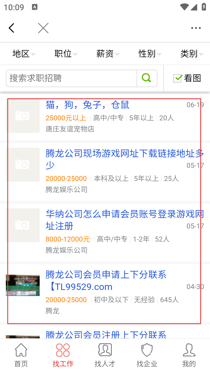 2、在【求职招聘】页面,切换到【找工作】栏,能查看各类宠物相关岗位,按需筛选合适简历。