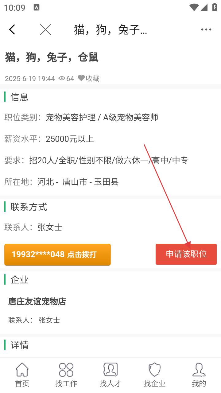 4、点开感兴趣岗位,如【猫-狗-兔子-仓鼠】,查看薪资、要求等信息,点击【申请该职位】投递简历。