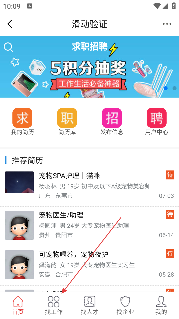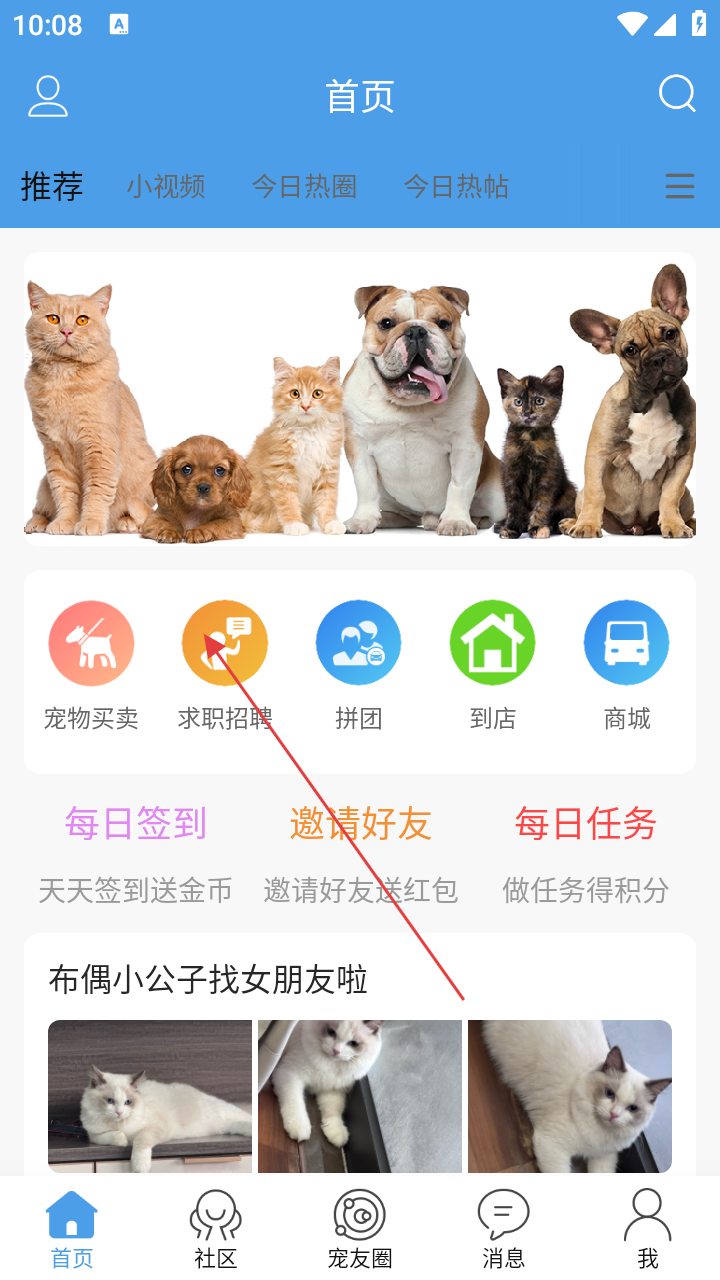 1、进入【首页】后,可先浏览推荐内容,若想找工作,点击【求职招聘】图标,开启宠物行业求职之旅。
