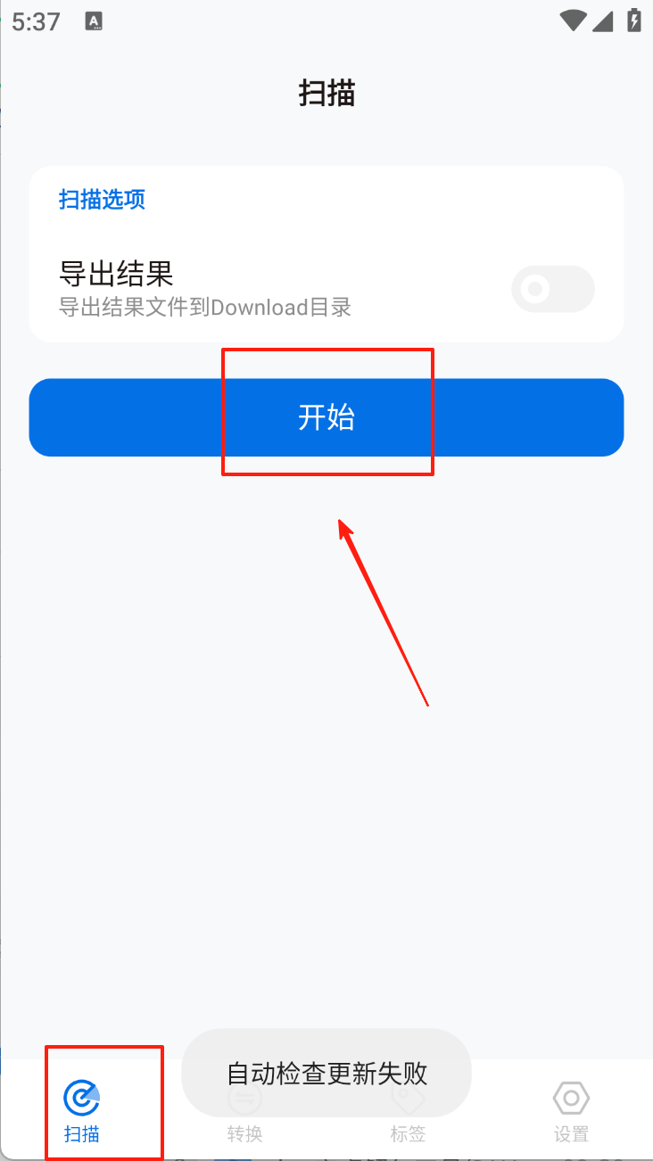 2、在扫描界面,点击“开始”按钮进行扫描。点击开始按钮以导出结果文件到下载目录。