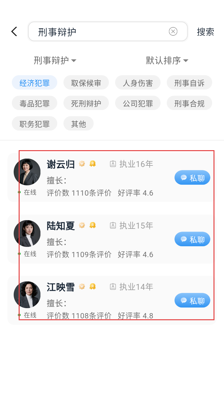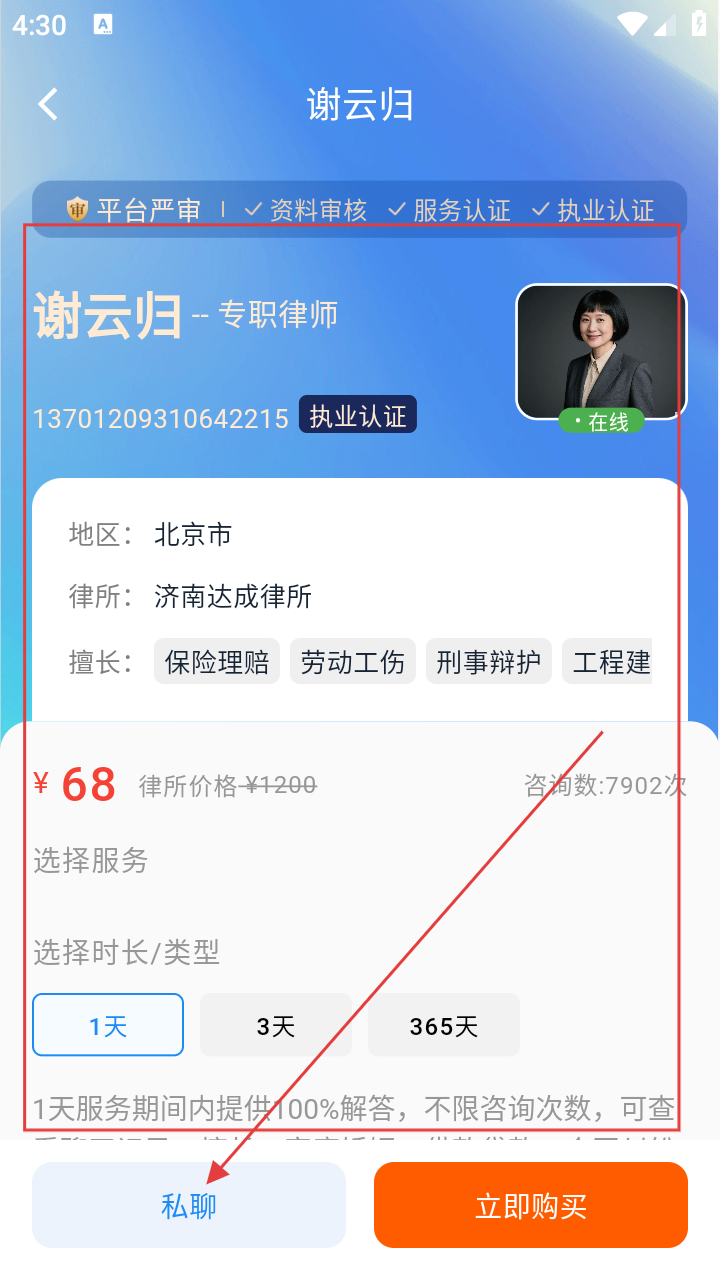 3、进入律师主页,查看专长、价格等信息,点击【私聊】按钮,发起与律师的沟通。