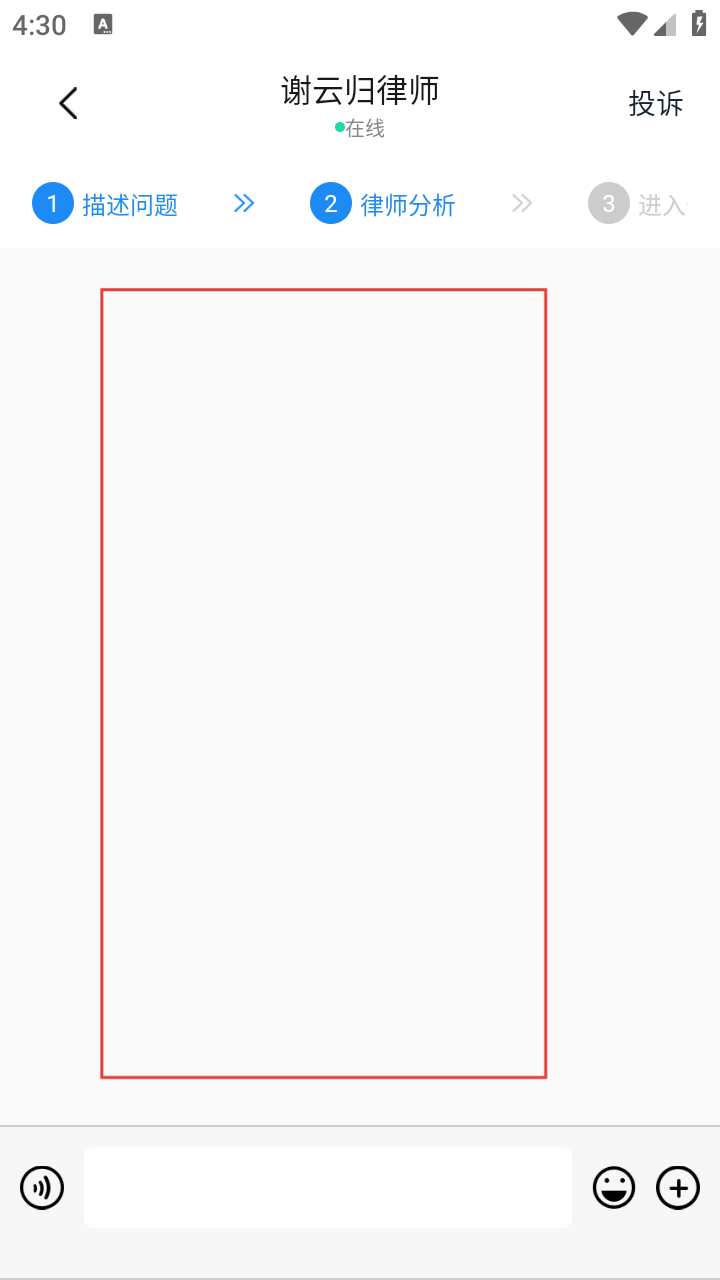 4、在私聊界面,按【描述问题】、【律师分析】流程,输入法律问题,与律师在线咨询。