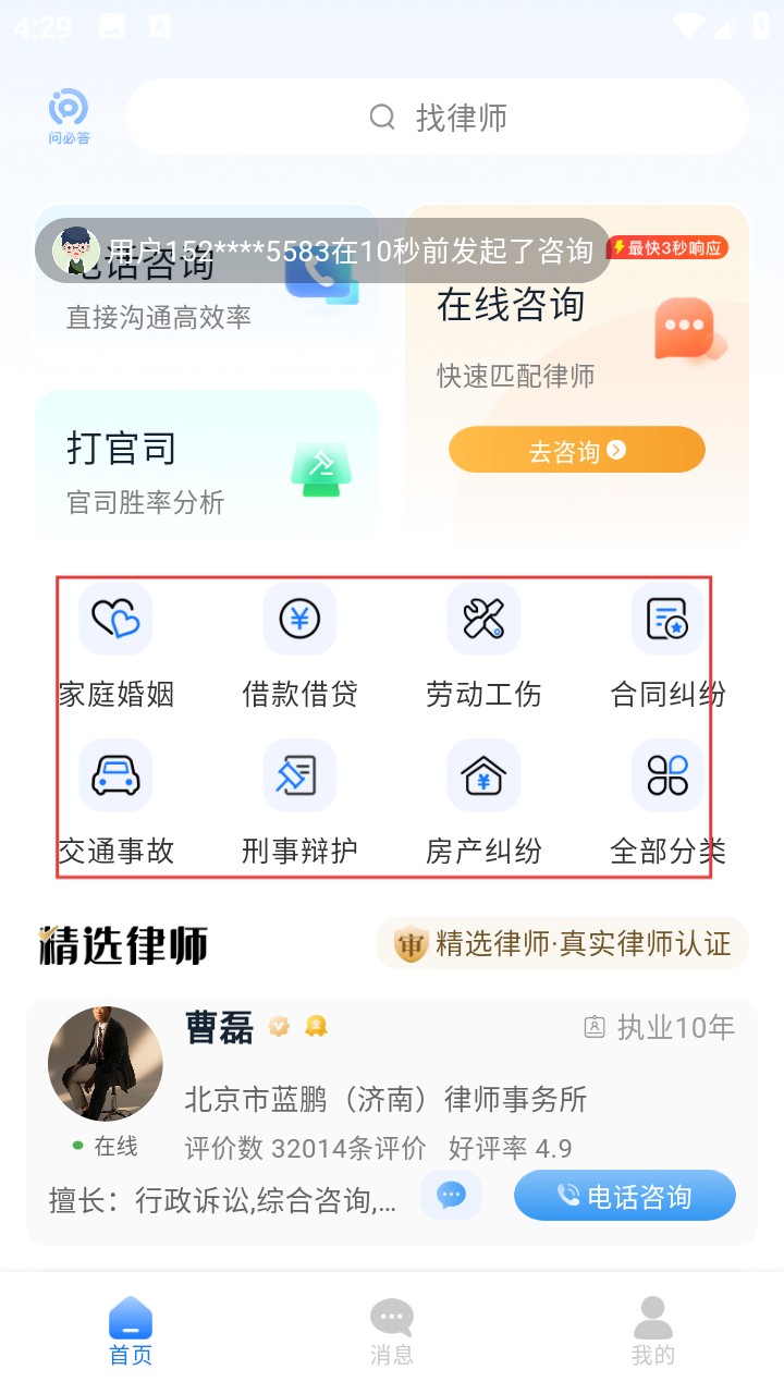 1、进入应用,在首页选择【刑事辩护】等法律分类,精准匹配对应律师咨询服务。