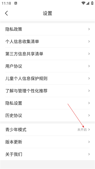 3、在【设置】页面,点击【青少年模式】,进入青少年模式介绍页面,可了解该模式的功能与规则。