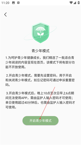 4、在【青少年模式】页面,点击【开启青少年模式】,即可开启该模式,为青少年提供健康的阅读环境。