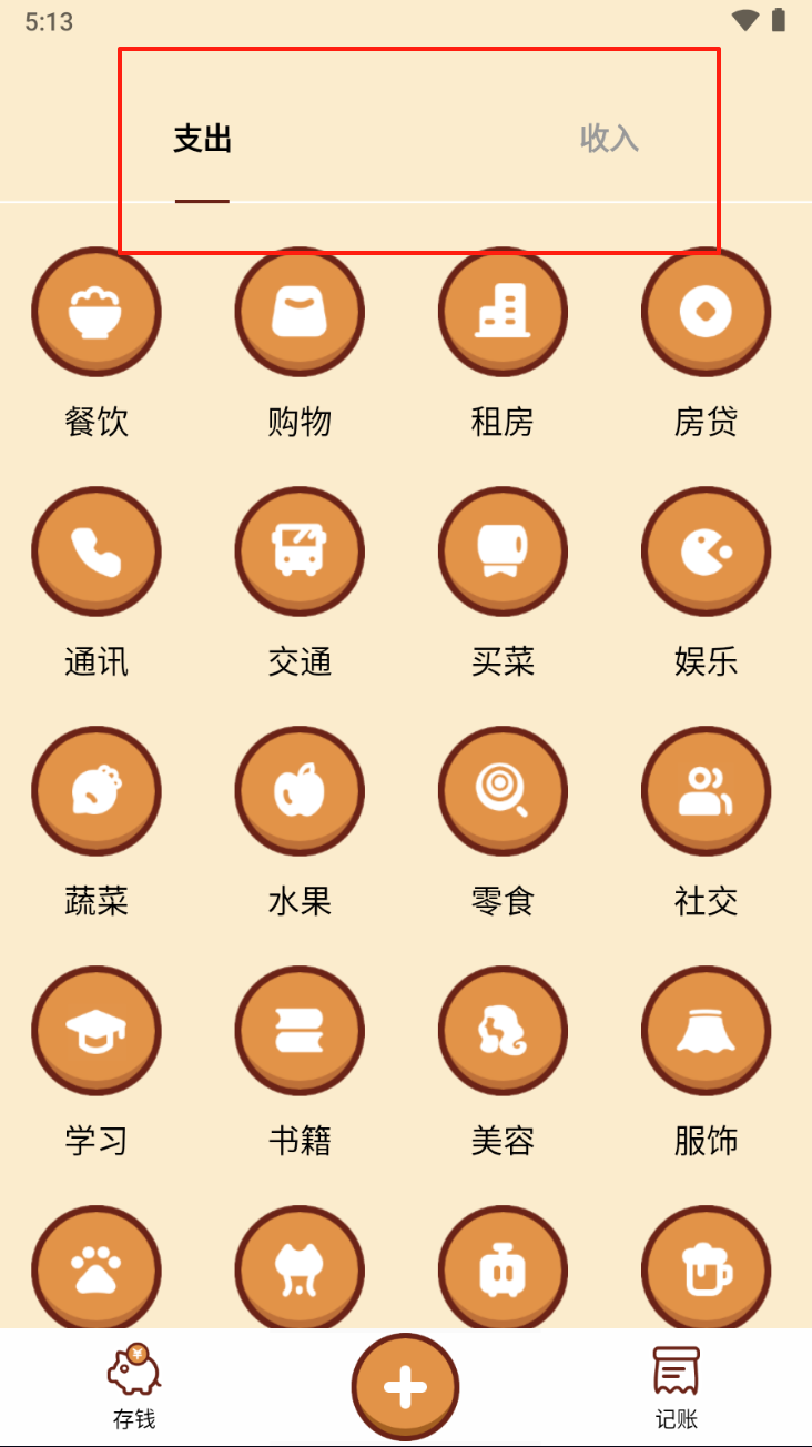 3、选择支出或收入类别。点击“支出”或“收入”标签,选择相应的消费或收入类别进行记录。