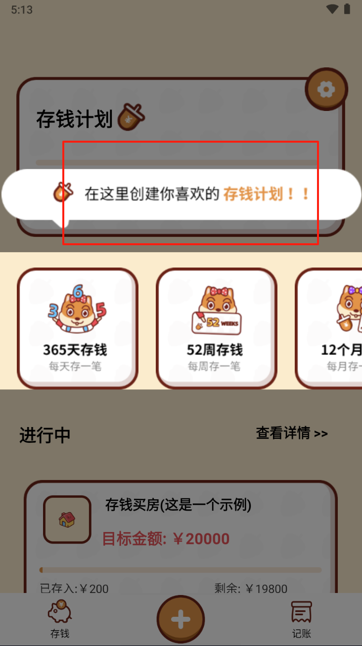 2、创建您的存钱计划。点击“在这里创建你喜欢的存钱计划!!”的提示框,开始设定您的储蓄目标。