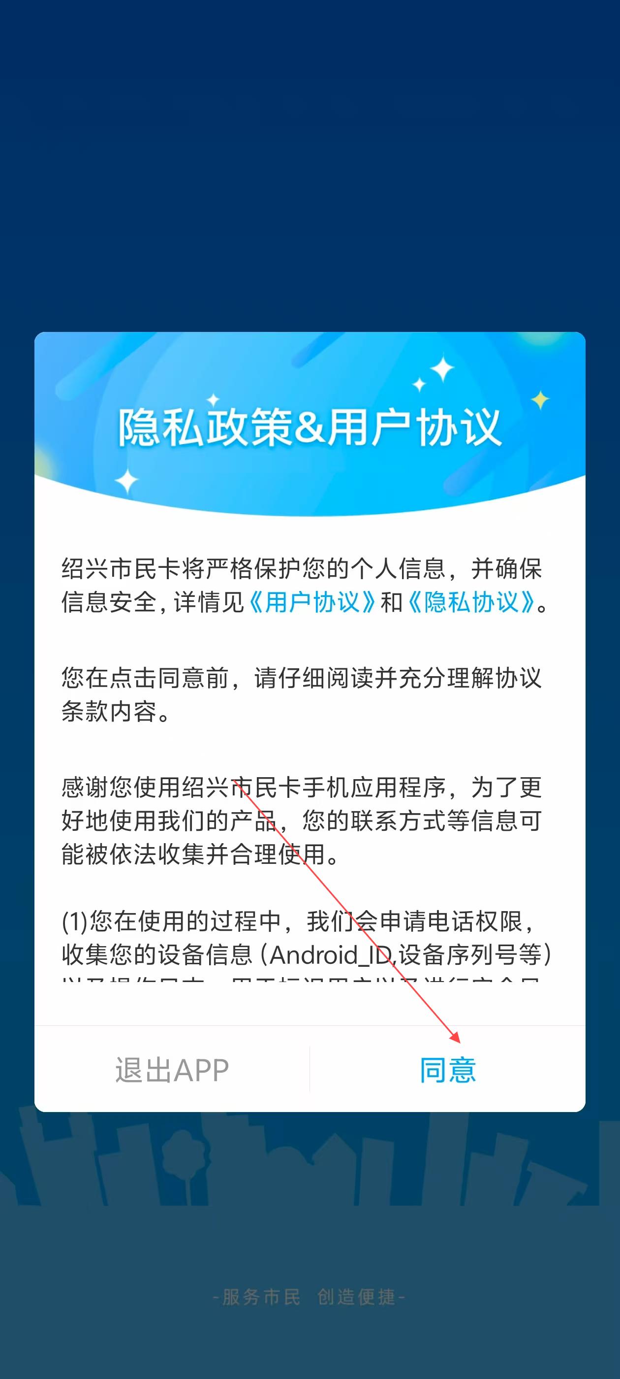 1、首次打开绍兴市民卡,阅读【隐私政策&用户协议】后点【同意】,进入首页。