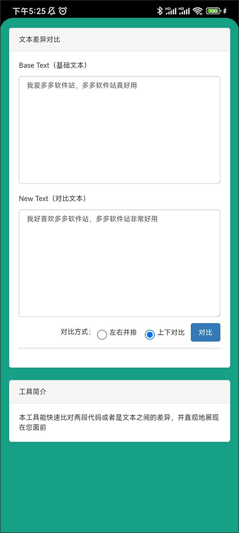 3、把两段有待对比的文本,各自粘贴至对应的两个输入框里,接着点击 “对比” 按钮,就能实现差异识别。