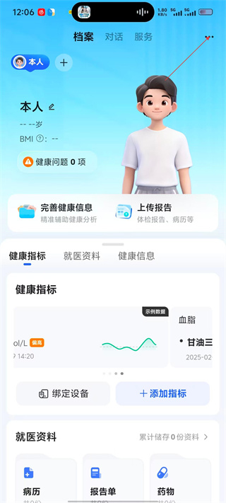1、在【档案】页可管理健康信息,支持完善个人资料、上传报告,还能查看健康指标、就医资料等内容。