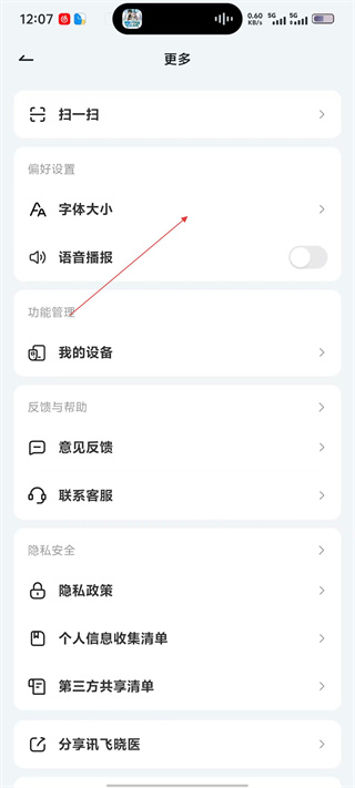 2、进入【更多】设置页,可调整字体大小、开启语音播报,还能管理设备、反馈意见或查看隐私相关内容。