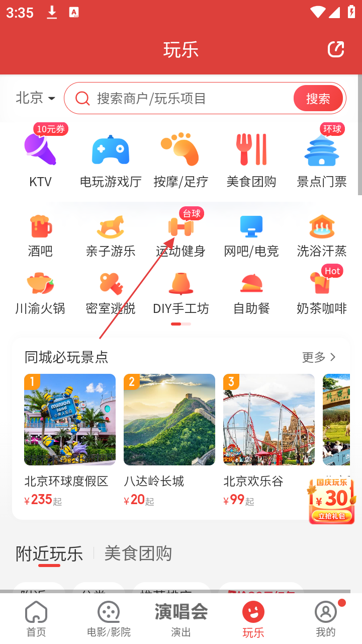 2、在玩乐页面,有KTV、电玩游戏厅等多种玩乐分类,还有同城必玩景点推荐,可选择【运动健身】分类。