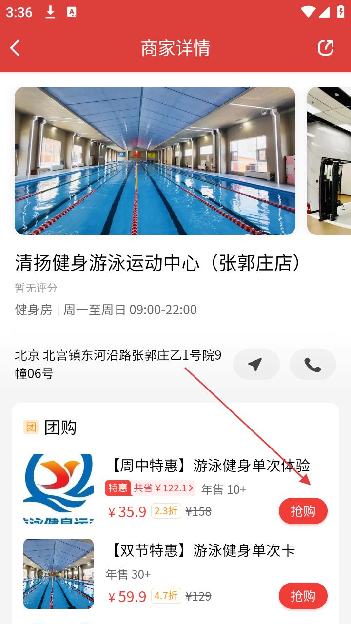 4、进入商家详情页,可查看商家地址、营业时间等信息,若有团购活动,点击【抢购】按钮即可参与。