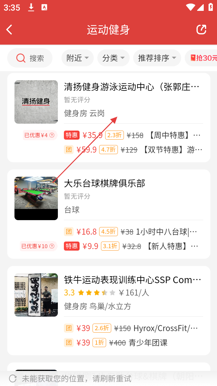 3、进入运动健身页面,可看到多个运动健身商家,如【清扬健身游泳运动中心】等,选择感兴趣的商家。