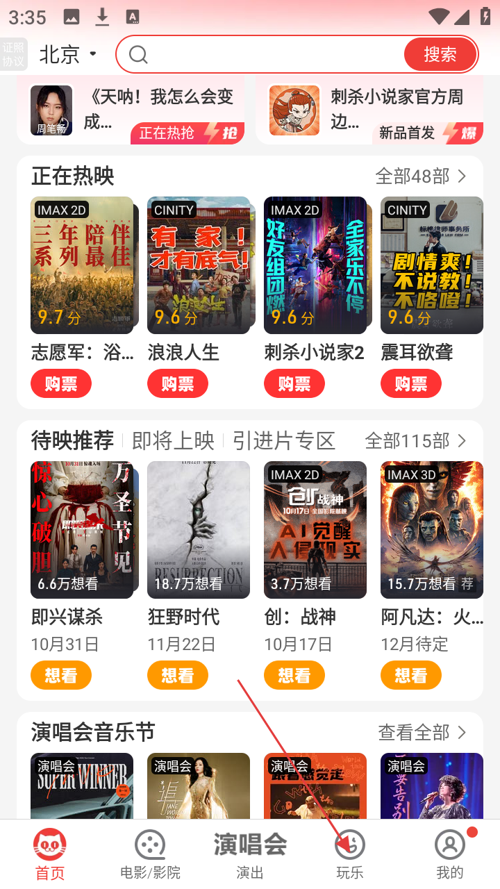 1、打开猫眼电影,首页有正在热映、待映推荐的影片及演唱会音乐节等板块,点击底部【玩乐】可进入玩乐页面。