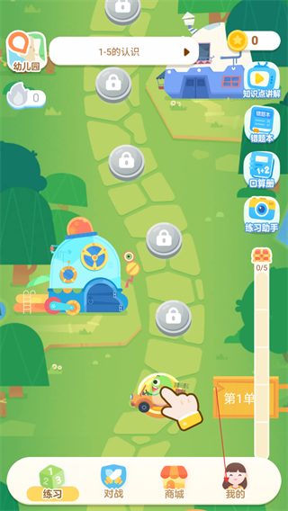 1、在【叫叫口算】练习界面,有“1-5的认识”等学习内容,还有知识点讲解、错题本等功能入口,点击【我的】可进入个人界面。