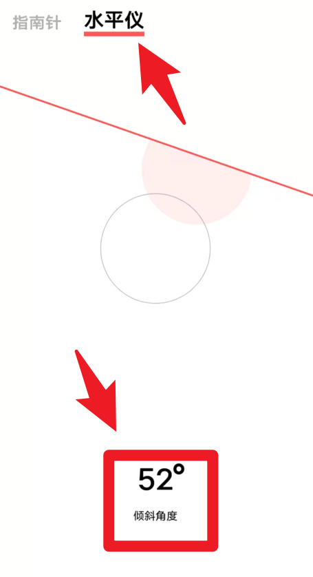 3、切换到水平仪页面后,用户能够实时监测手机的倾斜角度,方便进行家具摆放或水平测量。