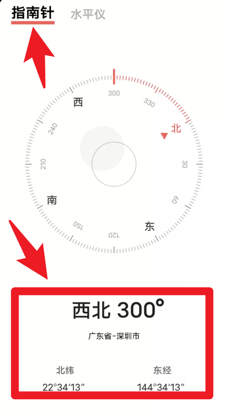 2、在指南针功能界面,可以直观查看当前所处方位与角度,同时显示详细的经纬度及所在城市。