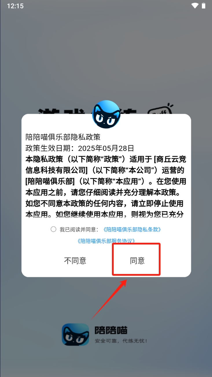 1、同意隐私政策:阅读并同意陪陪喵俱乐部的隐私政策,点击“同意”按钮继续。
