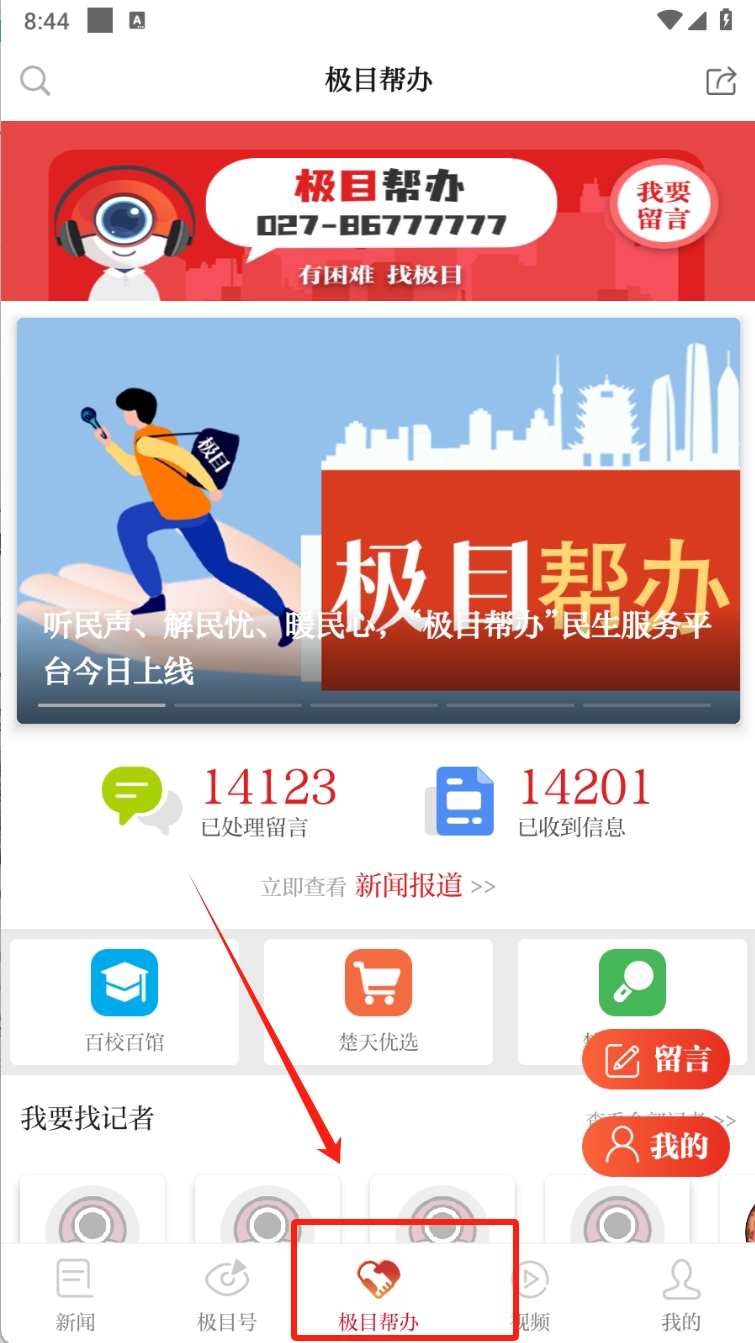 3、进入极目帮办页面,您可以查看已处理的留言和收到的信息,了解民生服务平台的功能和使用情况。